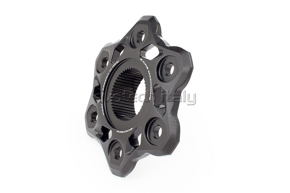 CNC machined sprocket holder flange for Ducati (6-hole models), characterized by an angular and captivating look.