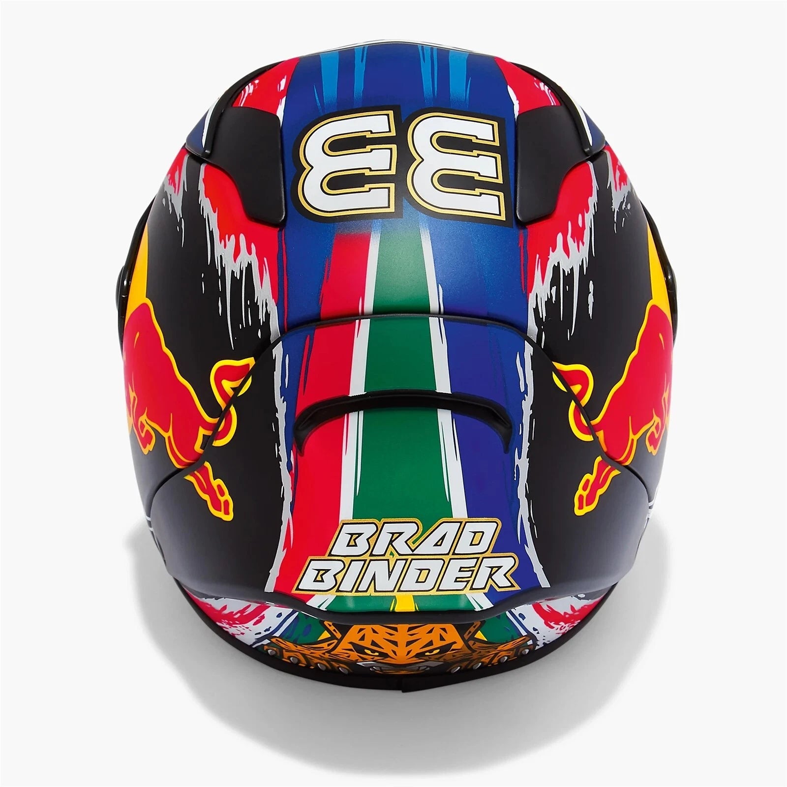 Casco replica dal design dinamico e colorato, con il nome di Brad Binder, il suo numero (33), il marchio Red Bull, il logo HJC Cascos, la bandiera sudafricana e una rappresentazione artistica del leopardo