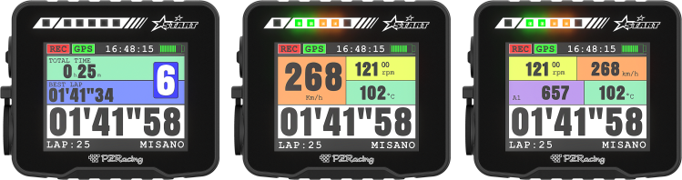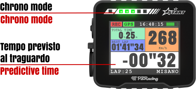 Grazie al nuovo display touch TFT da 320x240 pixel, con luminosità da 1000mcd, Start garantisce una visibilità impeccabile anche in pieno sole. Il sistema touch “Gloves Sensitive” permette un controllo totale anche con i guanti da pista.